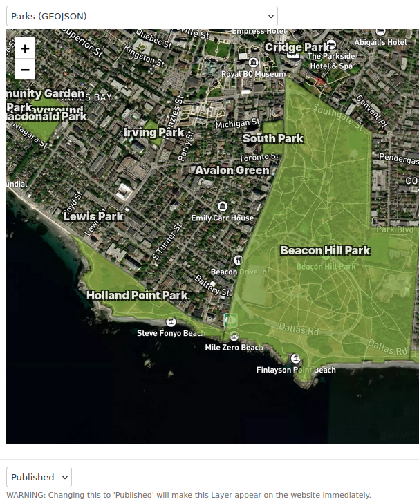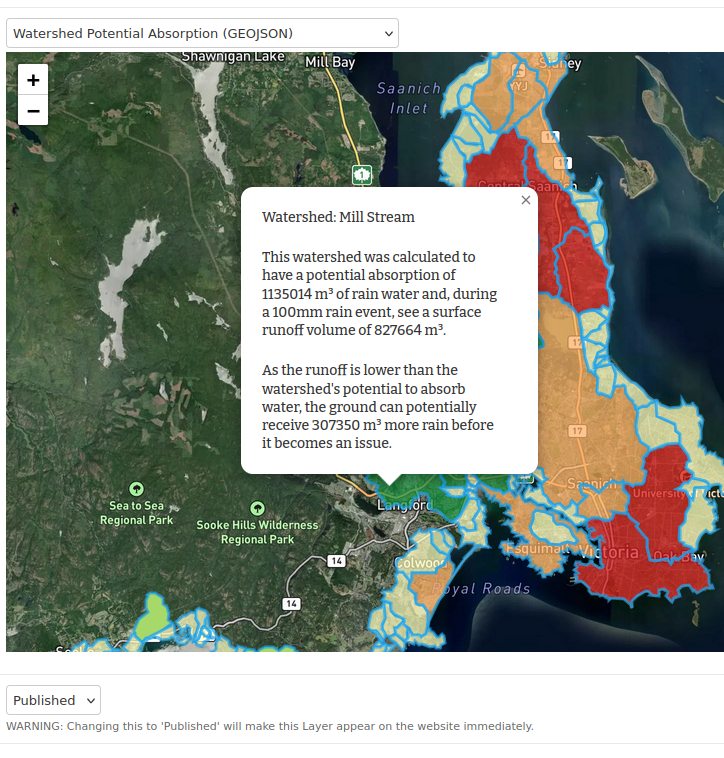 Typescript files are transpiled and bundled for the frontend using Vite, and Leaflet.js is used to render a live map-preview for users while they edit geographic data. PostgreSQL stores most of our data, but we also keep some larger media files (like raster data) offsite using Backblaze’s B2 buckets.